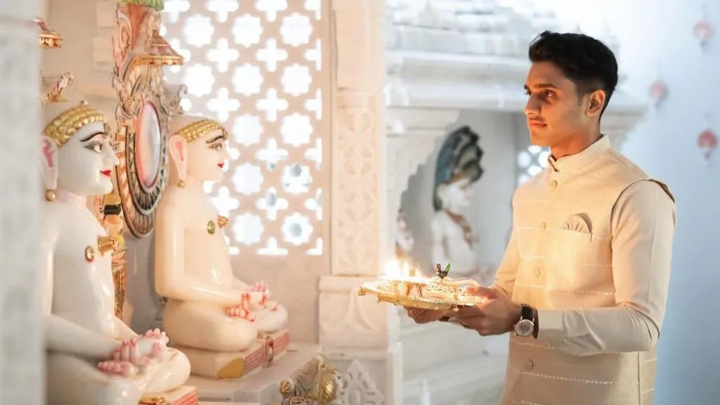 For Dev, 19, a Jain from North London, Diwali is a deeply spiritual occasion. For Jains, Diwali marks the moment when Lord Mahavira, the founder of Jainism, reached Moksha—eternal bliss. Dev explains that Diwali is not about feasting and partying but about self-reflection, fasting, and cleansing the body in preparation for prayers and rituals aimed at attaining liberation and breaking the cycle of reincarnation. Instead of fireworks, Jains light divas (oil lamps) to honor the divine and maintain peace in the atmosphere.