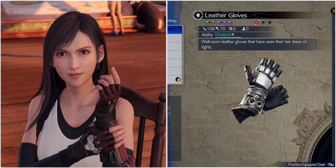 Tifa’s default Leather Gloves unlock the Divekick ability, a great tool for bringing down flying enemies. It’s more about strategy than raw damage, allowing Tifa to reach enemies otherwise out of her grasp.